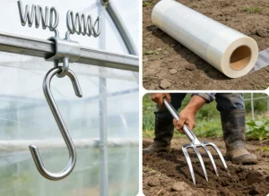 • Ветровой крюк двойной крюк: Используется для надежного зажима плёнки на каркасе теплицы. Оцинкованная сталь или прочный пластик предотвращают коррозию и повреждение полотна.