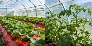 • Сельхозплёнка для клубники в теплицах: Часто это мульчирующая плёнка (черная или двухцветная), которая предотвращает рост сорняков, сохраняет влагу и не дает ягодам касаться земли.
